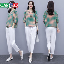 卡帝乐鳄鱼亚麻套装女2021夏天新款宽松流行格子中袖休闲套装棉麻阔腿裤子 绿色 S