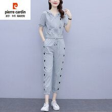 皮尔卡丹轻奢女装 运动休闲套装裤女2021年夏季新品短袖连帽卫衣九分裤时尚两件装潮针织 灰色 M(建议90-100斤)