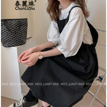 春麗珠 连衣裙2021年女装夏季新款韩版大码轻熟休闲时尚女装胖mm炸街遮肉显瘦T恤背带裙两件套套装裙 黑色 3XL