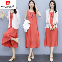 皮尔卡丹 棉麻连衣裙女两夏天新款修身气质中长款时尚休闲套装裙子垂感凉快百搭 橘红色 M