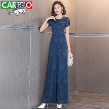 卡帝乐鳄鱼(CARTELO)雪纺连体阔腿裤套装女2021夏季息款洋气假两件时尚减龄气质连衣裤 藏蓝提花连体 XL