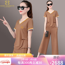 EIGHTMONKEYS轻奢品牌运动套装女夏季新款时尚新疆棉麻服冰丝短袖阔腿裤休闲两件套2021女装 卡其 M(建议80-100斤)