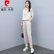 皮尔卡丹法国轻奢女装 天丝棉醋酸套装女夏2021年新款冰丝雪纺束脚裤两件装绸缎洋气时尚针织 米色 L【111-125斤穿】