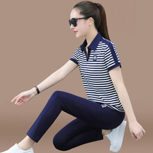 慕之美 休闲时尚运动套装女夏T恤衫短袖长裤运动休闲套装女夏款时尚大码polo领跑步服条纹两件套 宝蓝色 XL(建议110-120斤)