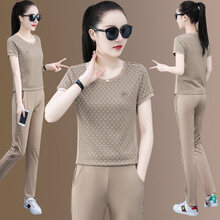 慕之美 休闲时尚运动套装女夏季2021新款时尚圆领短袖长裤大码洋气休闲服两件套棉 杏色 M 【80-98斤】不褪色