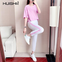 HUISHI卉饰 香港潮牌时尚运动套装女2021年夏季新款韩版洋气减龄紫粉色T恤休闲两件套 粉紫色 S 建议80-100斤