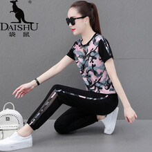 袋鼠(Daishu)休闲时尚套装女2021年夏季新款薄款宽松显瘦印花洋气运动两件 粉色 M(建议80-100斤)