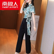 南极人时尚轻奢女装休闲裤2021年夏季中国风拼接名媛碎花旗袍阔腿连体连衣裤套装女 绿色 S