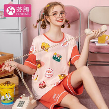 芬腾 女士睡衣纯棉2021年夏季新品短袖短裤时尚撞色印花圆领舒适家居服套装女 虾粉 L