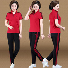 言衣庭 休闲运动套装女夏季旅游装中年妈妈夏装两件套2021新款有领短袖T恤洋气中老年运动服套装女 红色 5XL(150-160+斤)赠送 收藏优先发货