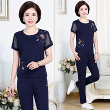 晋豪云翔 高端品牌中老年运动套装女夏季大码棉质圆领短袖T恤运动服女装休闲健身运动装女中年妈妈装 宝蓝 3XL