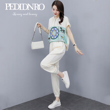 PEDIDNRO轻奢品牌运动套装女2021新款夏季休闲套装女薄款洋气减龄显瘦九分裤印花冰丝两件套 杏色 S