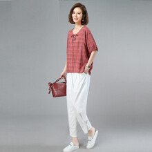穆夏百合时尚休闲套装女上衣两件套套装裤子2021夏装新款夏季女装气质宽松休闲裤女哈伦裤萝卜裤九分裤 西瓜红+白色 XL