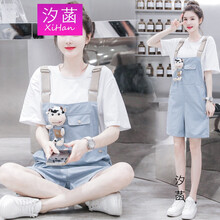 汐菡2021夏季新款学院风女生背带裤可爱型直筒裤高中生牛仔背背裤套装女夏天中学生女宽松吊带裤两件装2 蓝色套装 M