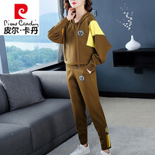 皮尔卡丹轻奢品牌女装 秋季新款冰丝针织两件装休闲运动套装女宽松撞色连帽卫衣套装时尚针织 秋香黄 S