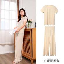 翊尚美 睡衣女冰丝夏季薄款短袖长裤宽松休闲可外穿出门小雏菊套装家居服圆领套头舒适透气 雏菊款-米白色 均码(80-140斤)