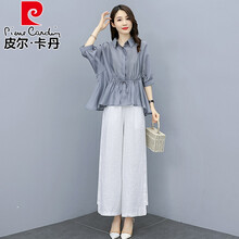 皮尔卡丹法国轻奢女装 宽松休闲上衣两件装2021夏季薄款减龄显瘦九分裤棉麻阔腿裤套装女针织 灰色 XL