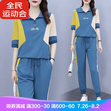 三彩马 大码时尚套装裤女夏装2021减龄洋气运动休闲两件套舒适柔软透气显瘦束脚裤套装 蓝色 大码XXL
