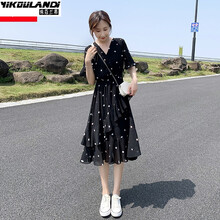 雪纺连衣裙女2021夏季新款女装春款韩版大码时尚套装女休闲衣服夏天短袖碎花棉麻雪纺裙子套装裙 黑色 M