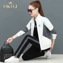 OKOJ品牌休闲运动套装女立领拼接2021春秋新款韩版减龄洋气卫衣外套棒球服潮三件套 白色 M