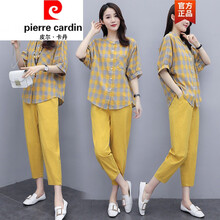 皮尔卡丹官方大牌女装 小个子时尚洋气棉麻套装女2021夏天新款宽松休闲亚麻哈伦裤两件套套装气质女装 黄色 S