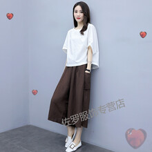 罗滨 诚品女装遮肉显瘦棉麻套装繁念国潮国风休闲两裤裙 白色+咖啡色 M建议105斤--120斤