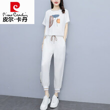 皮尔卡丹高端轻奢 休闲时尚套装女夏季2021新品洋气印花卫衣裤小个子减龄运动两件装针织 白色 XL(116-125斤)