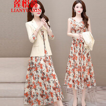 莲悦鑫连衣裙大码显瘦两件连衣裙女夏季2021新款春秋今年流行小西服碎花雪纺套装裙子559 A杏色小西装+黑黄碎花雪纺裙套装 3XL130到140斤