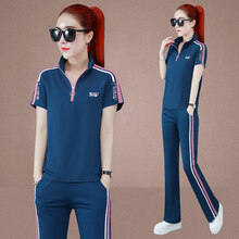 慕之美 休闲棉质短袖阔腿裤运动休闲套装女夏天2021新款时尚立领跑步服两件套潮 孔雀蓝 XL【建议体重110-121】