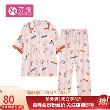 芬腾 女士睡衣纯棉2021年夏季吸盘花边袖口翻领短袖印花开衫家居服套装女 浅虾色 L