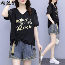 韩丝梵短袖t恤女2021夏季新款韩版宽松时尚心形印花大码女装上衣休闲套装 5046#黑色上衣 XL【建议110-125斤】
