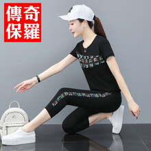 传奇保罗2021年夏季新款女短袖圆领时尚休闲运动修身显瘦印花运动套装 黑色 M 建议穿85-100斤