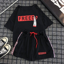 FreeGo轻奢品牌休闲运动套装女夏天新款时尚韩版学生宽松短袖短裤跑步两件套 黑色【2件套】 M【短袖+短裤】