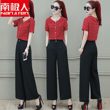 南极人2021夏季新款时尚阔腿裤套装女夏款圆点雪纺衫洋气减龄两 深红色 S