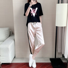 CMQ香港潮牌短袖t恤长裤圆领夏季套装新款女时尚运动休闲服装碎花两件 黑色上衣‖粉色裤子 L