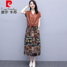 皮尔卡丹法国轻奢女装 棉麻两件装连衣裙女夏季2021年新款半身裙套装裙夏天休闲亚麻裙子针织 锈红色 M