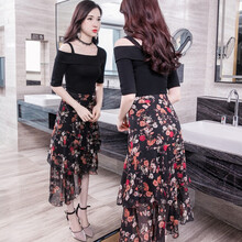 YISHAN两件套套装裙小清新碎花一字肩连衣裙套装高档气质性感露肩雪纺半身裙修身显瘦女装 黑色 M