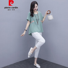 皮尔卡丹轻奢高档休闲时尚棉麻卫衣套装女装夏装2021年新款亚麻小个子短袖减龄两件套针织 绿色 M