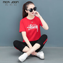 支持鴻星尔克运动服套装女夏休闲两件套女装新款潮衣服短袖显瘦闺蜜装 红色【七分裤】 L 100-115斤