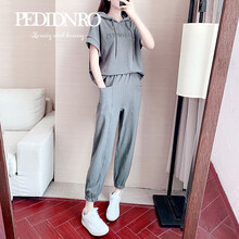 PEDIDNRO轻奢品牌运动套装女2021新款夏季时尚透气宽松显瘦休闲套装女跑步服连帽灰色两件套潮 灰色 S