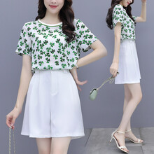 Elycra 连衣裙女装套装2021年夏季新款时尚短袖印花雪纺衫宽松高腰显瘦休闲套装女 绿色 S(建议80-95斤左右)