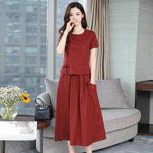 短袖麻料连衣裙女装妈妈装两件裙子套装夏天休闲时尚套装裙 红色 S