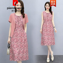 皮尔卡丹官方品牌高档 碎花棉麻连衣裙女夏季2021年新款时尚气质修身显瘦两件套套装亚麻长裙气质女装 粉色 M