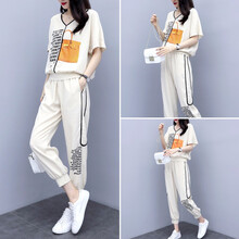 莱倪晟纳连衣裙短袖女装2021年夏季新款韩版宽松显瘦时尚印花两件套套装沙滩休闲套装女 米白色 M