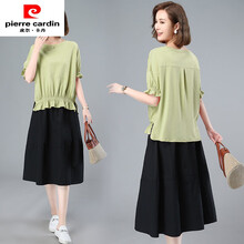 皮尔卡丹 夏季新款宽松时尚套装裙子中长款休闲文艺两棉麻连衣裙女垂感凉快百搭 绿色 M