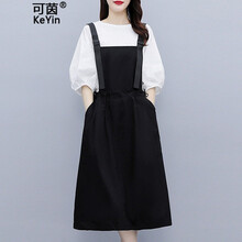 可茵 背带裙女装套装2021夏季新款大码女装胖mm炸街减龄时尚宽松遮肉两件套套装裙连衣裙子女潮 黑色 L