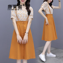 唐菓蜜 碎花连衣裙女2021夏季韩版女装套装时尚气质上衣高腰显瘦中裙小个子洋气减龄显高a字裙两件装女 图片色 S