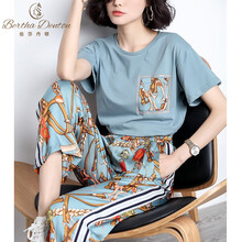 伯莎丹顿品牌女装印花运动套装女2021年夏季新款洋气减龄时尚圆领T恤休闲阔腿裤套装两件套 蓝/花色 L