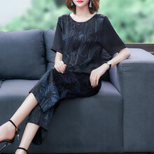 高档轻奢品牌贵夫人妈妈真丝套装2021夏季新款高端洋气宽松阔太太阔腿裤两件套套装透气显瘦时尚女装 蓝色 L