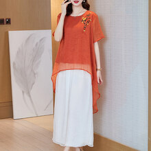 高档轻奢品牌高端大码女装今年流行的夏装套装中年妈妈棉麻上衣短袖气质裙子女透气显瘦时尚女装 橘红色 L